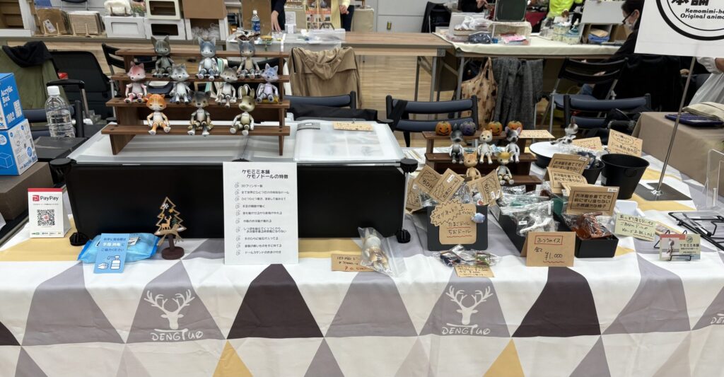 他の多くのドールイベントと同じく、卓は横一列全て隙間なく並べられているので、卓の前へは大回りしていかなければならず、いかに席側のままで卓上のメンテナンスやお客様とのやりとりが完結するように配置するかがポイントになると思います。